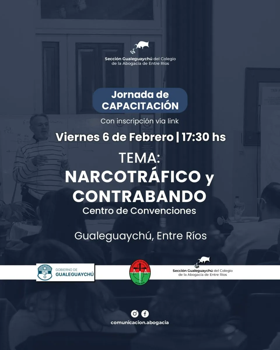 Este viernes 6 de febrero, Gualeguaychú será escenario de una importante jornada de reflexión y análisis titulada “Narcotráfico y Contrabando”, organizada de manera conjunta por la Justicia Federal de Gualeguaychú, el Municipio y la Sección local del Colegio de la Abogacía de Entre Ríos.
